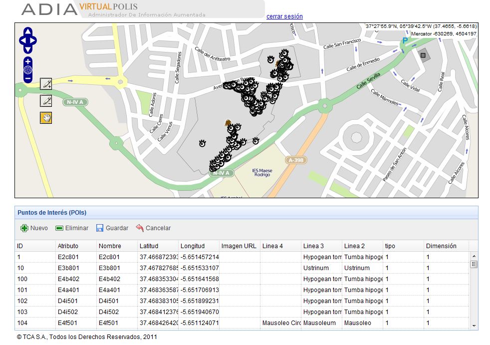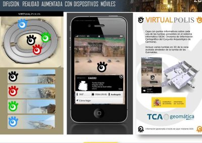 El proyecto VirtualPolis se ha realizado sobre la aplicación Layar para iOS y Android, y permite visualizar las estructuras funerarias y las fotografías de las tumbas del CAC, asociada a información multimedia compuesta por audioguia y videos.
